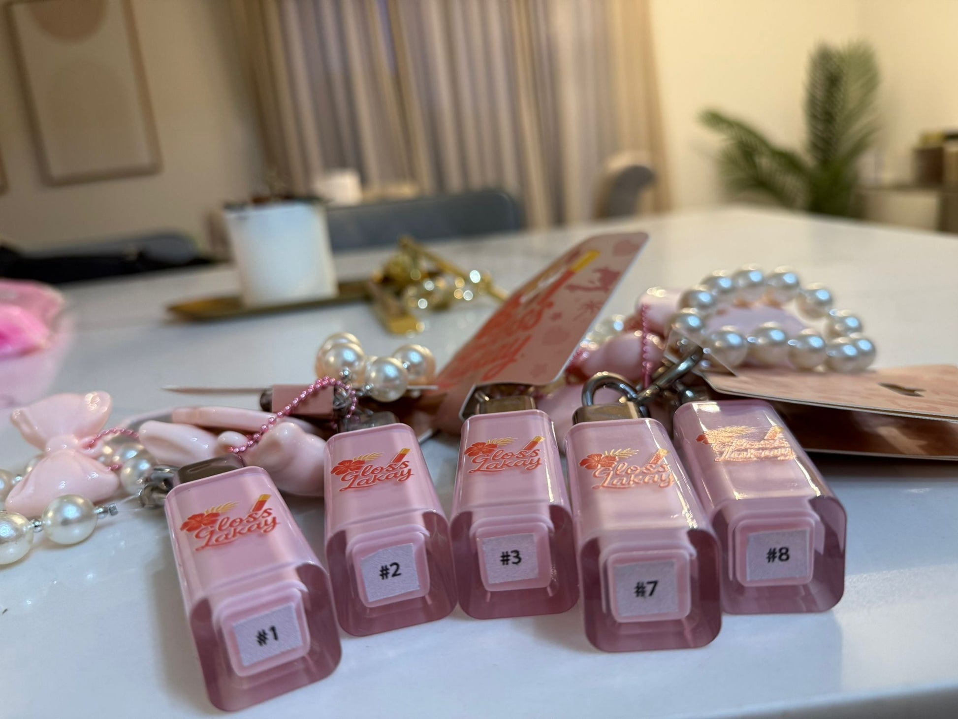 Carry beauty and elegance wherever you go with Gloss Lakay. This adorable set combines practicality and style, featuring a moisturizing colored lip gloss paired with chic accessories.